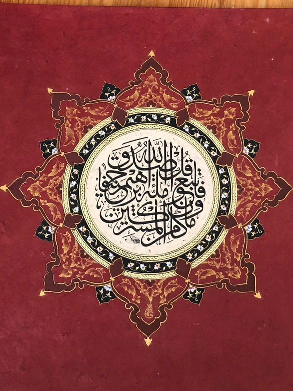 Decorative Elements: Tezhip artists use a variety of decorative elements, including geometric patterns, floral motifs, arabesques, and intricate scrollwork. These elements are meticulously painted in vibrant colors, often using gold and other metallic pigments to enhance the richness and visual appeal of the design.